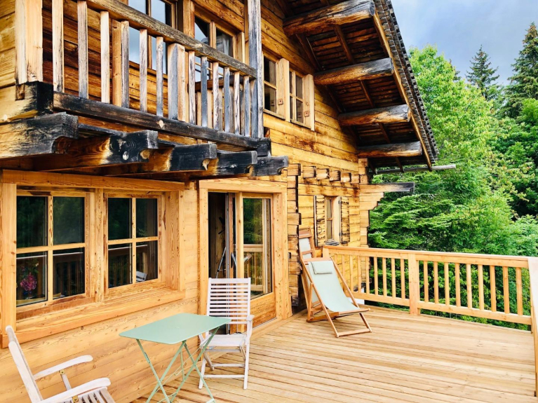 Elegante chalet tradicional de 170m² en 3 niveles, orientado al sur con una impresionante vista del valle de Manigod desde la gran terraza.
