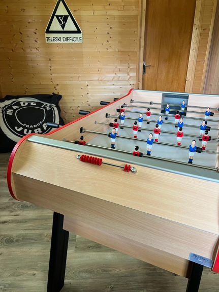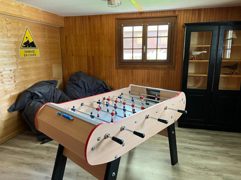 Una gran sala de juegos de 16 m2 con taburetes, un nuevo futbolín René Pierre y muchos juegos para todas las edades.