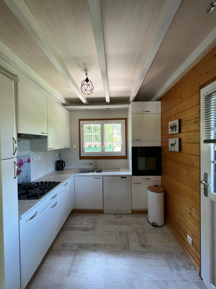 Una pequeña y funcional cocina equipada con lavavajillas, horno tradicional, microondas, cafetera Nespresso, nevera y congelador, así como todos los aparatos necesarios (raclette, fondue...)