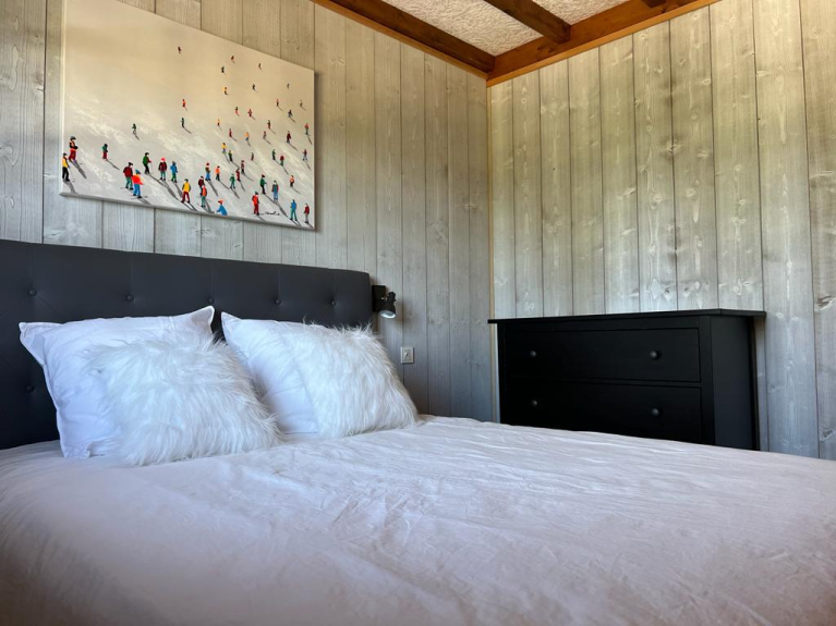 Un dormitorio con ambiente de montaña con una cama de 160x180, moqueta nueva en el suelo, cómoda para guardar la ropa.