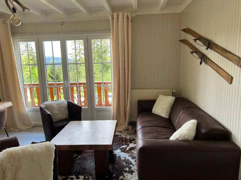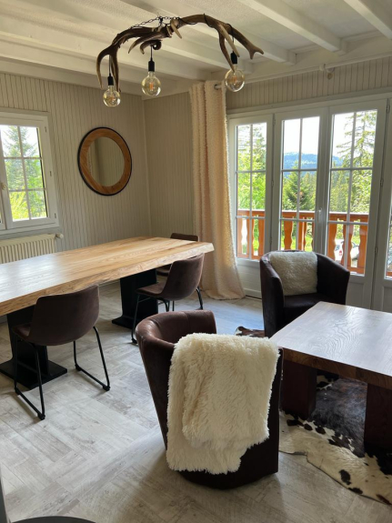 En el primer piso una gran sala de estar de 18 m2, ambiente cálido, montaña con una gran mesa, rincón de aperitivo con sofá, sillones, mesa de café, TV de pantalla plana (TV naranja, wii u, wifi) una gran ventana de la bahía dando en el balcón de 20 m2 (haciendo la vuelta del chalet en 2 caras), lo que permite la vista agradable y para beneficiarse del sol.