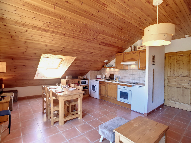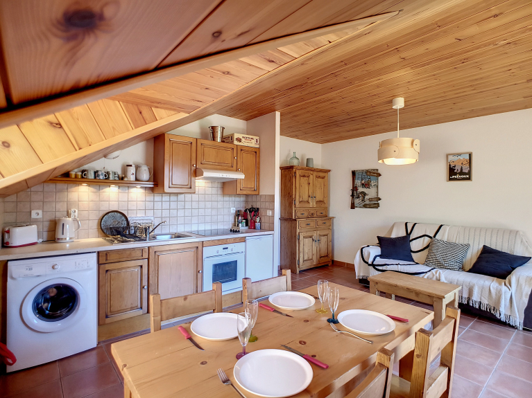 EQUIPAMIENTO : NO WIFI, lavavajillas, TV de pantalla plana, lavadora, horno, microondas, tostadora, hervidor de agua, cafetera, nevera-congelador, máquina de raclette, aspiradora, mobiliario de balcón (mesa + 4 sillas), 2 tumbonas, tendedero.