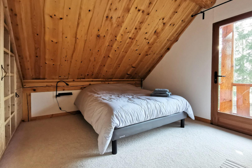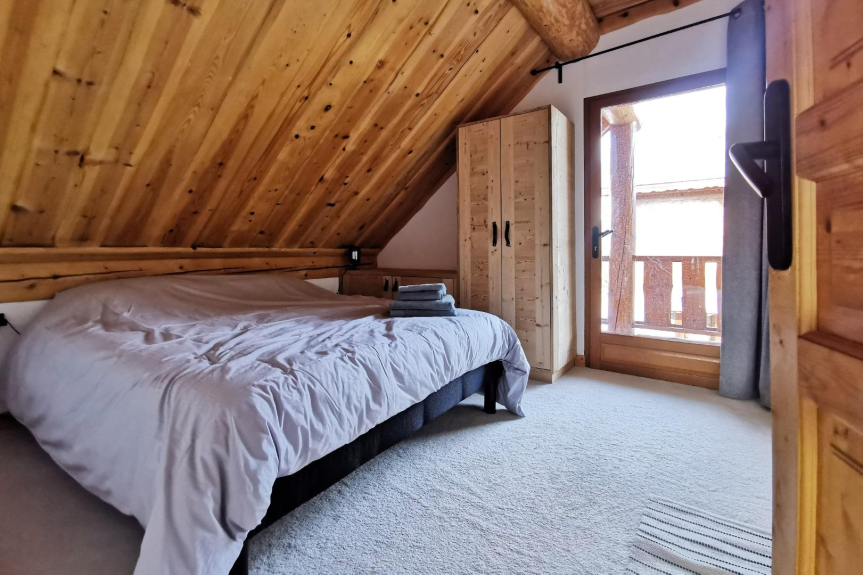 La 3er dormitorio de adultos es una suite principal situada en el anexo independiente frente al baño nórdico. Décoration moderno. Un espacio acogedor y despejado con calefacción por suelo radiante, estufa de leña y sala de esquí independiente.