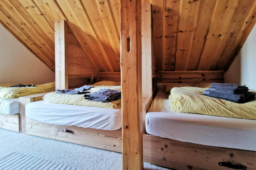 A En la planta superior, hay 2 dormitorios para adultos con camas de matrimonio (160 cm) y un dormitorio para niños con 3 camas individuales (140 cm). También hay un cuarto de baño/WC.