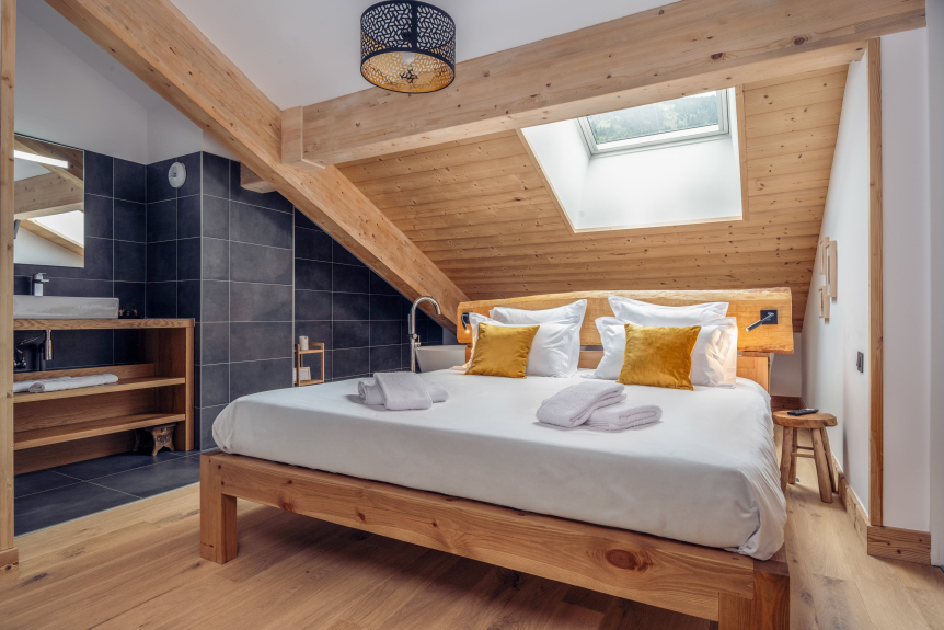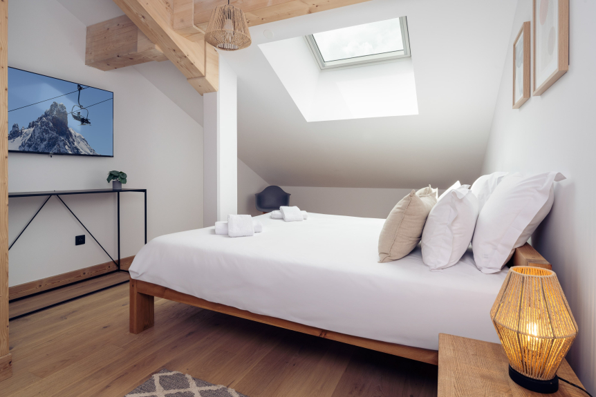 - Dormitorio 1 suite principal: cama doble king size (180x200), grandes ventanales, acceso a una gran terraza (20 m²) + baño contiguo (ducha, lavabo, wc, secador de pelo)