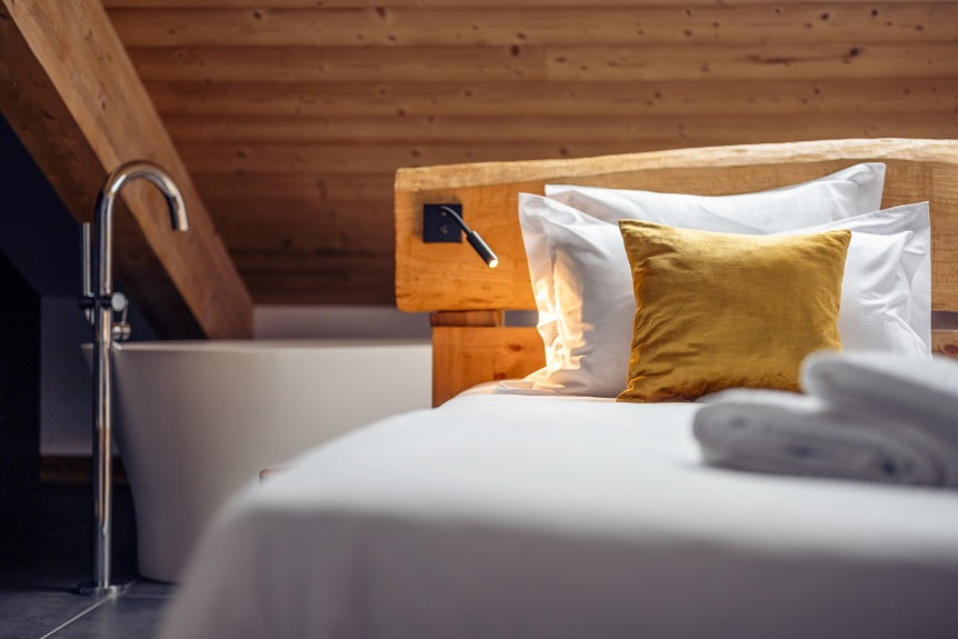 - Habitación 5 : suite principal : cama doble king size (180x200) con bañera en la habitación, lavabo, secador de pelo