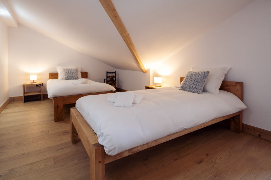 - Dormitorio 6 : cama doble king size (180x200) con baño privado al lado: bañera, lavabo doble, secador de pelo, wc