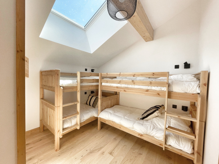 - Dormitorio de los niños: 2 literas (para 4 personas) con baño en suite: bañera, lavabo, wc.
