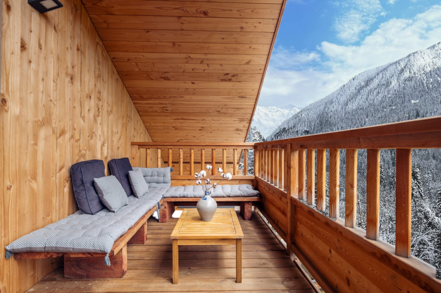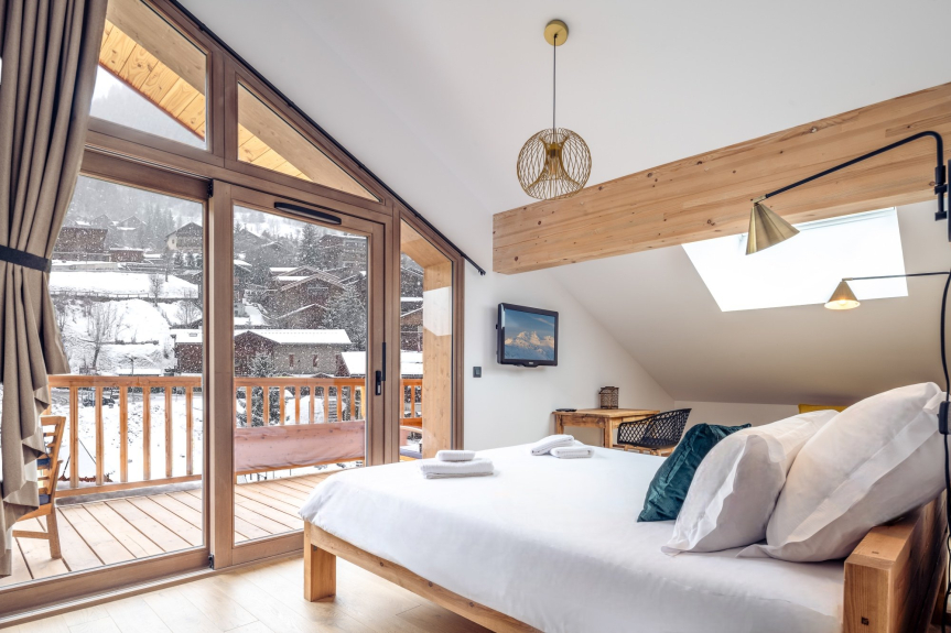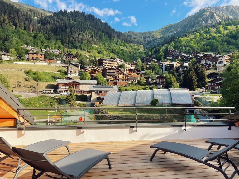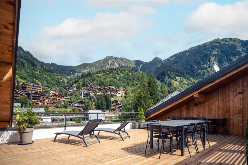 En el lado del salón, un gran balcón de 20 m² con vistas a las montañas y a Courchevel. Equipamiento: mesa y sillas de exterior, tumbonas.
