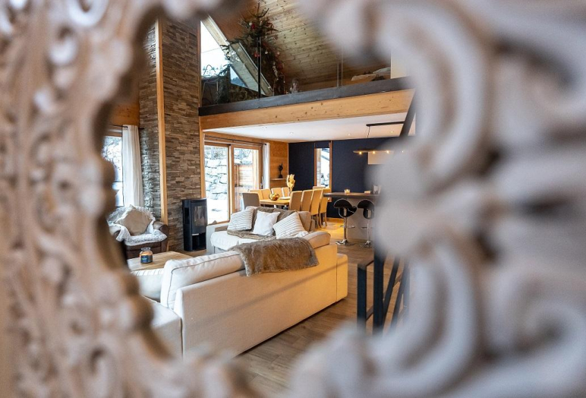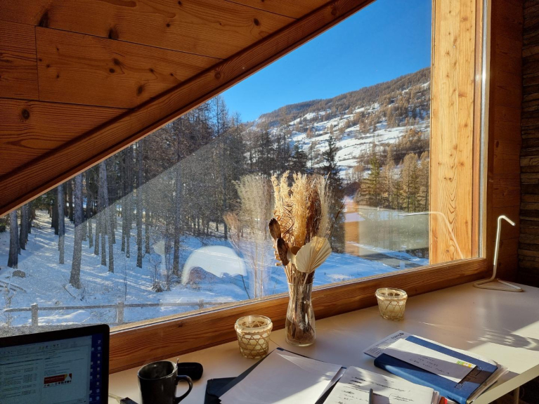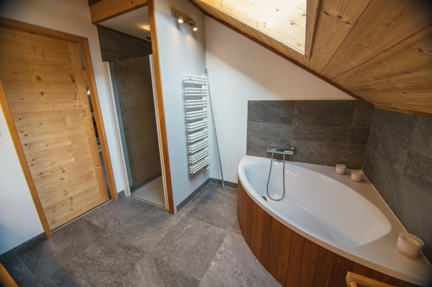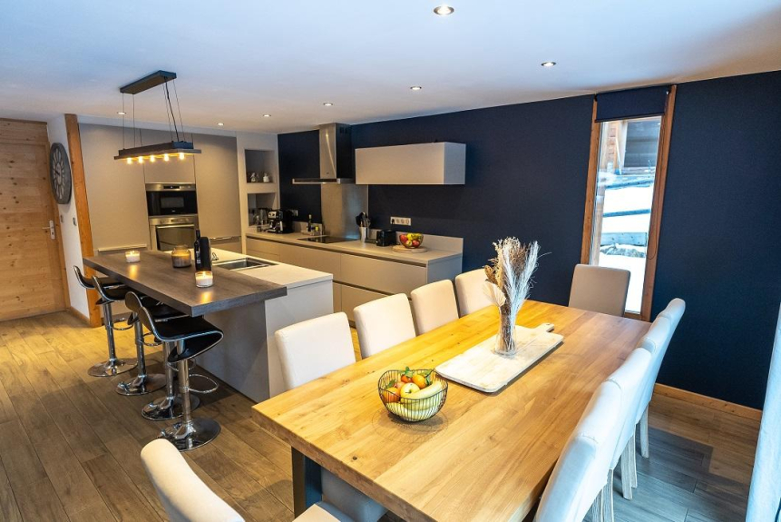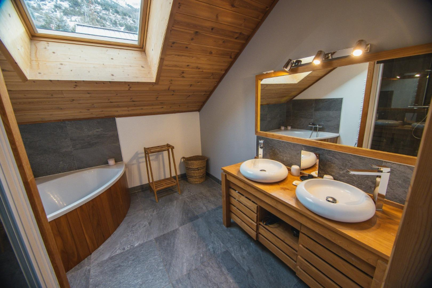 ..... con vistas al jardín totalmente privado: vista de la montaña, terraza de madera de alerce, gran mesa de madera, plancha, tumbonas, pista de petanca con bolas disponibles, ducha exterior, todo para un momento de relajación al aire libre y en calma