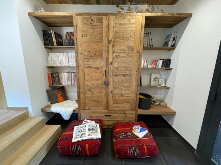 En nuestra casa, no hay televisión en el salón, pero hay estanterías llenas de novelas, cómics y revistas para todas las edades y cojines para crear rincones acogedores por todas partes para disfrutarlos. También hay un cofre con juguetes para los niños y juegos de mesa en los armarios.