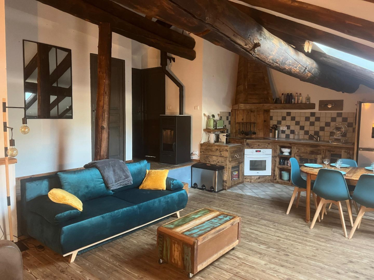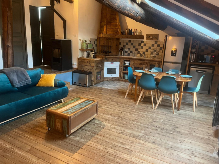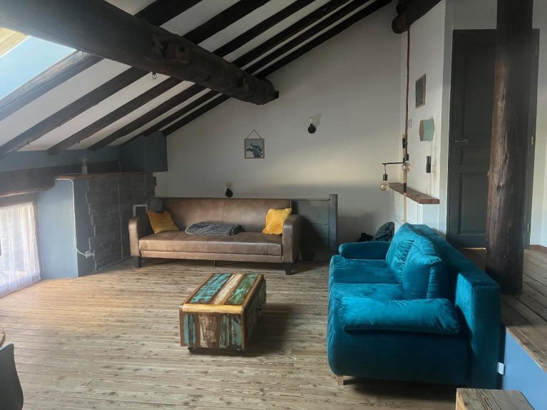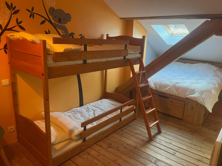 Para 6 personas, tiene 75 m2 en el suelo y se compone de 2 dormitorios (uno con una cama de 160 cm y el otro con 2 literas y una cama de 140 cm), un baño y un aseo separado. Una cocina abierta y un gran salón con 2 sofás cama completan este piso. En el vestíbulo de entrada hay un casillero para guardar todo el equipo de esquí.