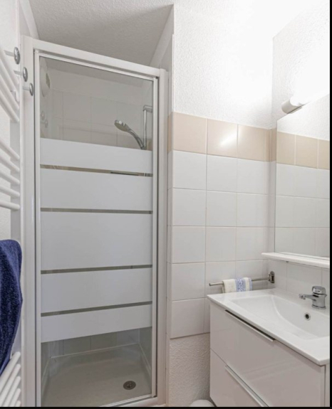 - Un cuarto de baño con ducha, lavabo con mueble, secador de toallas