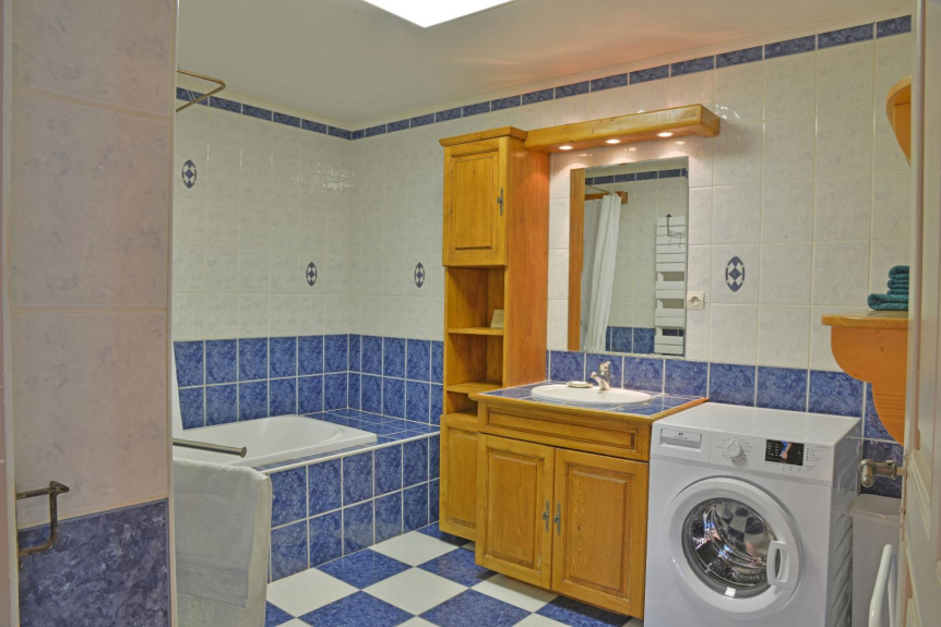 1 bañera utilizable como ducha (no apta para personas mayores), un lavabo, un secador de toallas y una lavadora.