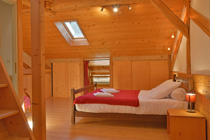 Gran habitación de unos veinte metros cuadrados, iluminada por 2 claraboyas y una pequeña ventana, que contiene una cama doble (140x190 cm), un armario y un alacena