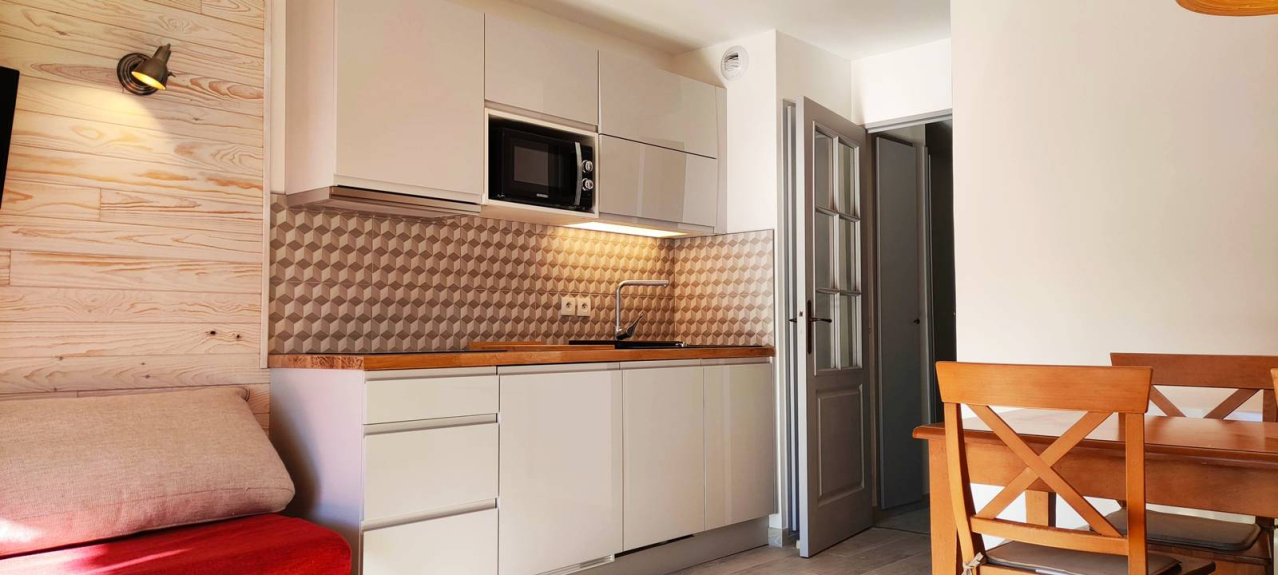 Piso de 2 habitaciones orientado al sur, con capacidad para 5 personas, situado a 50 m del funicular y a 100 m de una pista de esquí. Aparcamiento cubierto incluido.