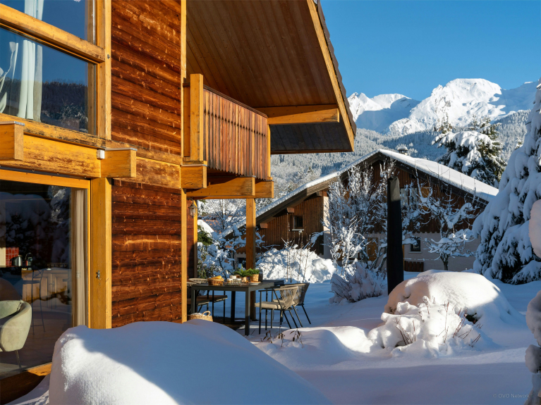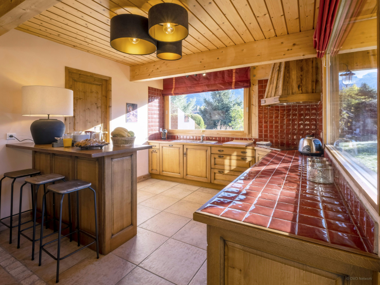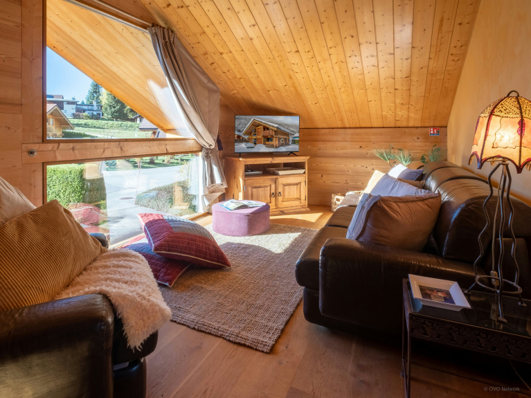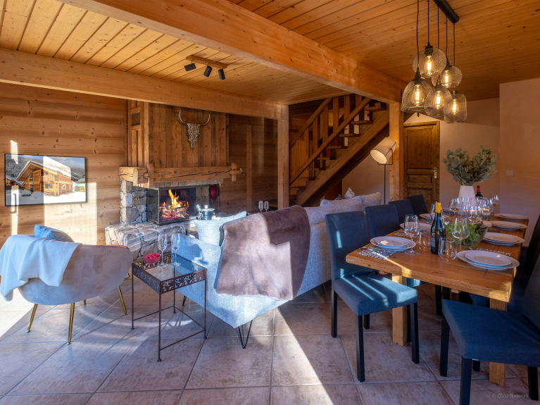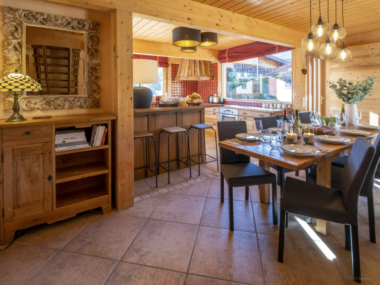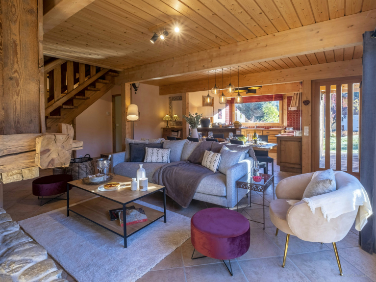 Los grandes ventanales iluminan las zonas de estar y ofrecen una impresionante vista del hermoso paisaje alpino. El jardín es un lugar ideal para que los niños jueguen o se relajen después de un día de actividades.