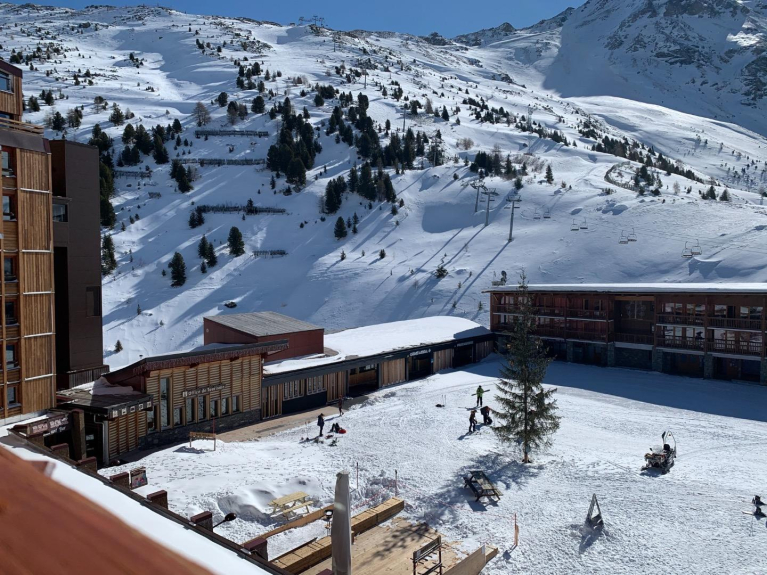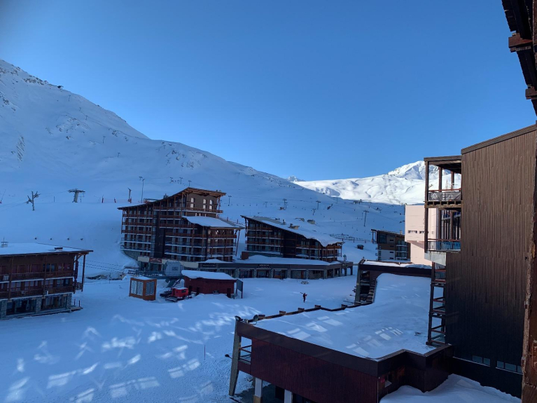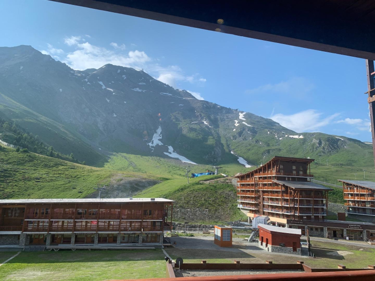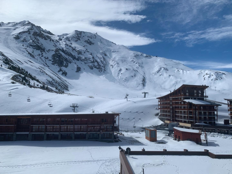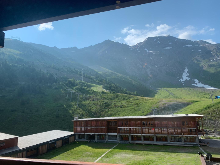 Consta de una zona de cabina cerrada con cama de matrimonio y 1 litera individual, un pasillo con armario, un cuarto de baño, una zona de cocina (LV, nevera, LL, microondas, horno, placa eléctrica, cafetera, tostadora, etc...), una sala de estar (cama de matrimonio plegable, sillas, bancos, mesa, TV de pantalla plana, mesa de centro) y un balcón con vistas a las pistas / remontes y a la zona comercial inferior.