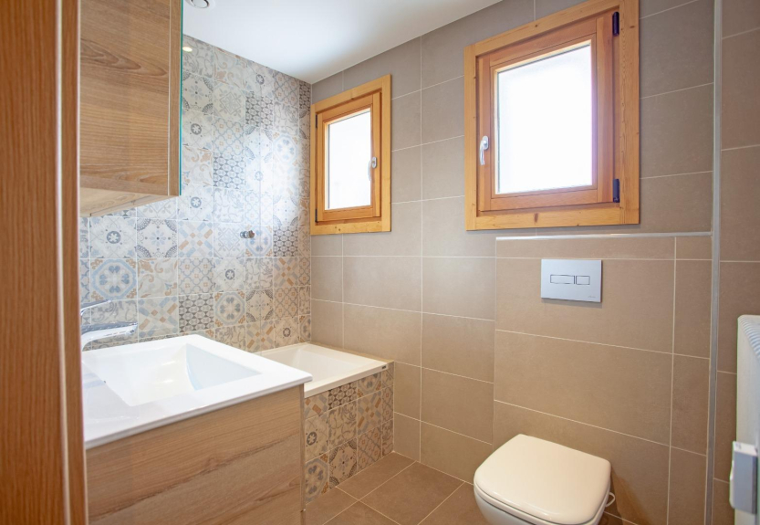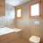 Cuarto de baño con bañera y mampara, mueble bajo lavabo con cajón, mueble bajo lavabo con espejo iluminado, WC, 2 ventanas.