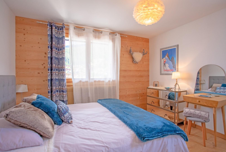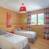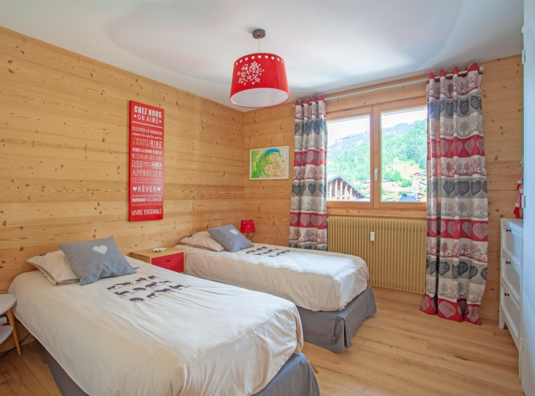 Habitación con 2 camas individuales de 90*190 (posibilidad de hacer una cama doble), edredones, mesillas de noche con lámparas, cómoda, armario con ropero y estanterías, reposapiés. Ventana con cortinas dobles y contraventanas.