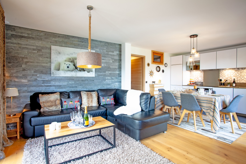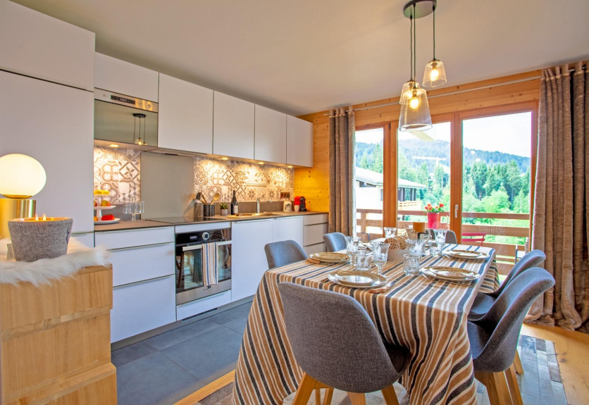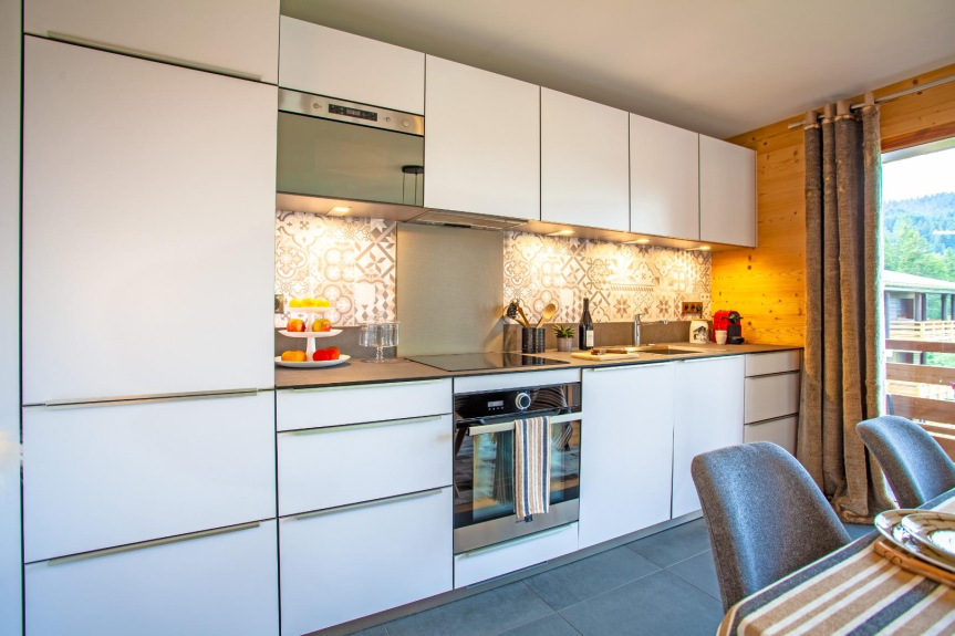 Cocina americana totalmente equipada: placa de inducción, horno multifunción, microondas, lavavajillas, frigorífico con congelador pequeño, raclette/pierrage para 8 personas, tostadora, cafetera de filtro, cafetera Nespresso (cápsulas no suministradas), hervidor de agua.