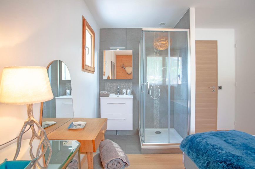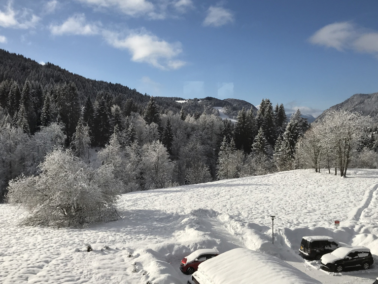 Amplia plaza de aparcamiento cubierta reservada (apta para un todoterreno grande), guardaesquís.