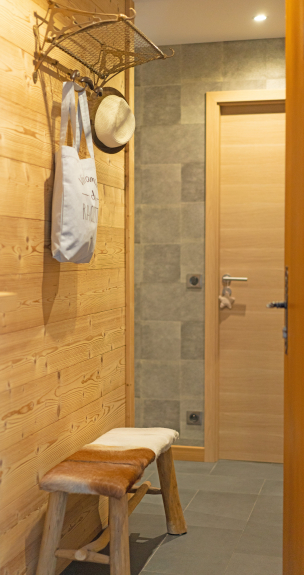 Entrada con banco y gran armario con perchas, equipo de esquí, numerosos estantes para botas y accesorios de esquí (casco, etc.).