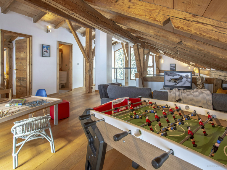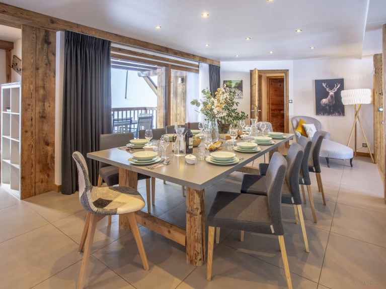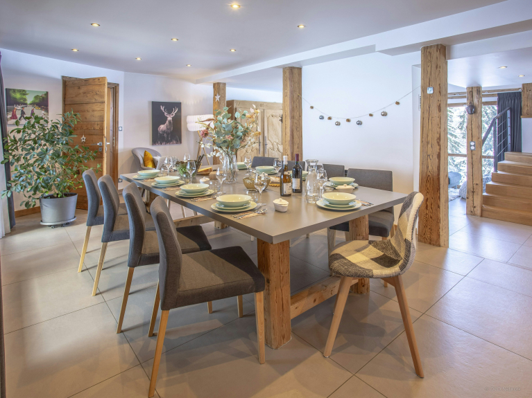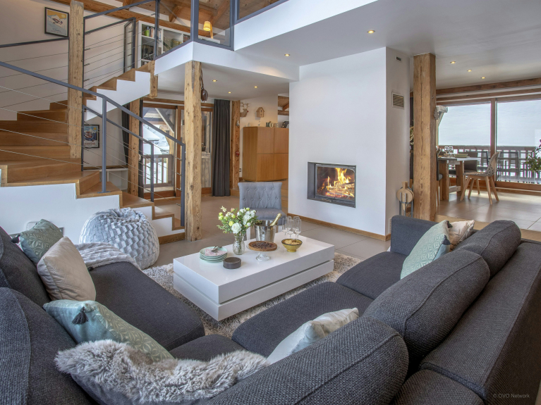 El salón es el lugar perfecto para relajarse después de un ajetreado día en la montaña: la luz entra a raudales por las ventanas de doble altura y hay una terraza cubierta y una bañera de hidromasaje. La cocina es suficientemente espaciosa para preparar una buena comida, y la barra de desayuno es ideal para las comidas de los niños. El comedor está separado del salón por una chimenea central, lo que hace que ambas zonas sean acogedoras.