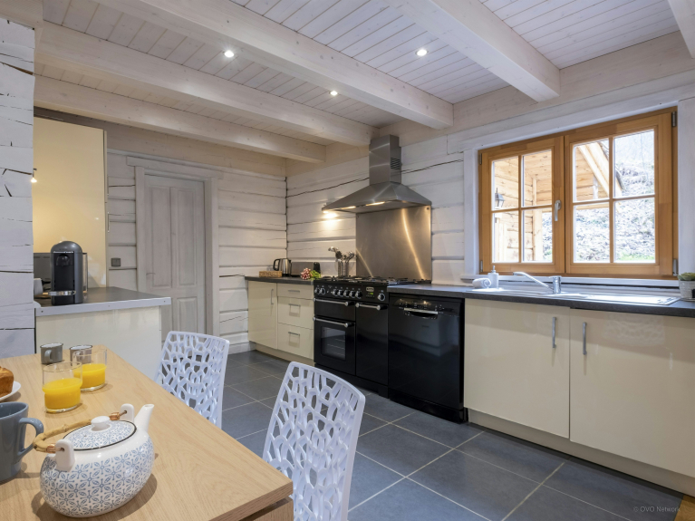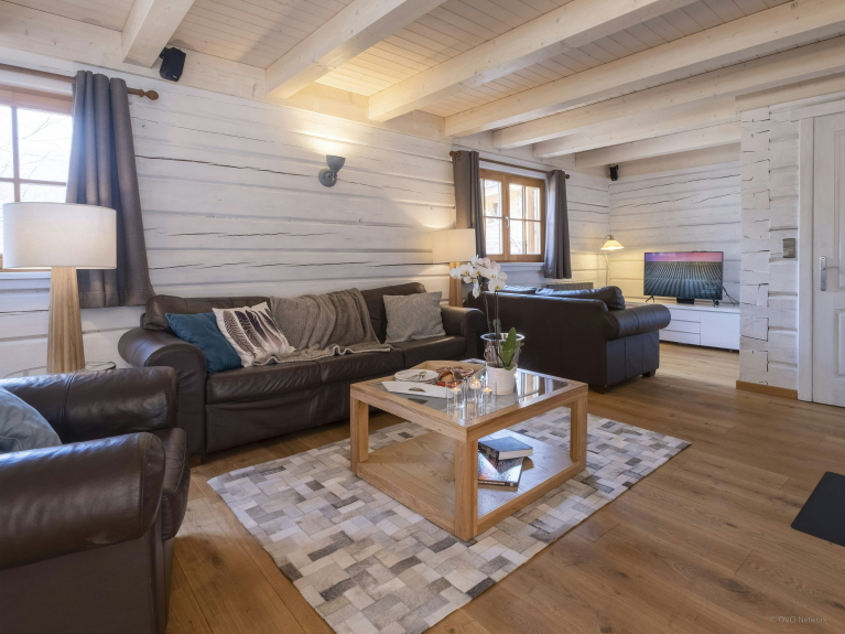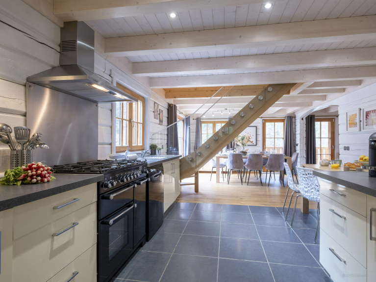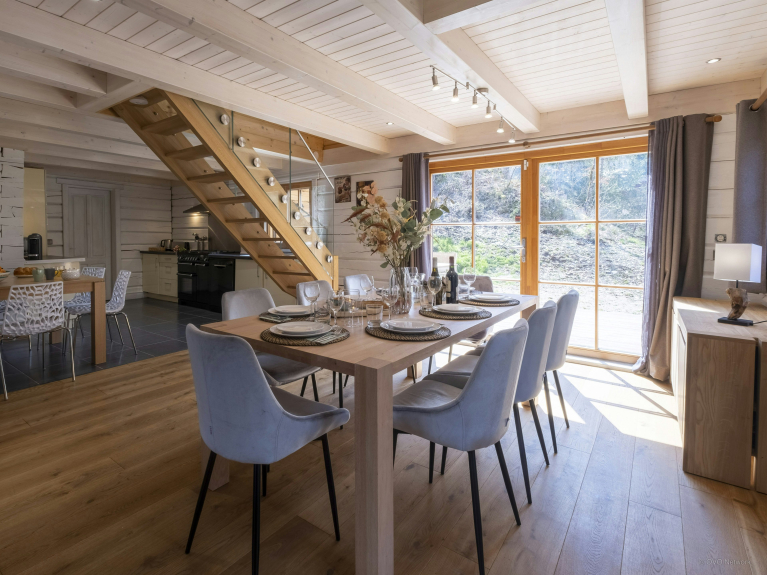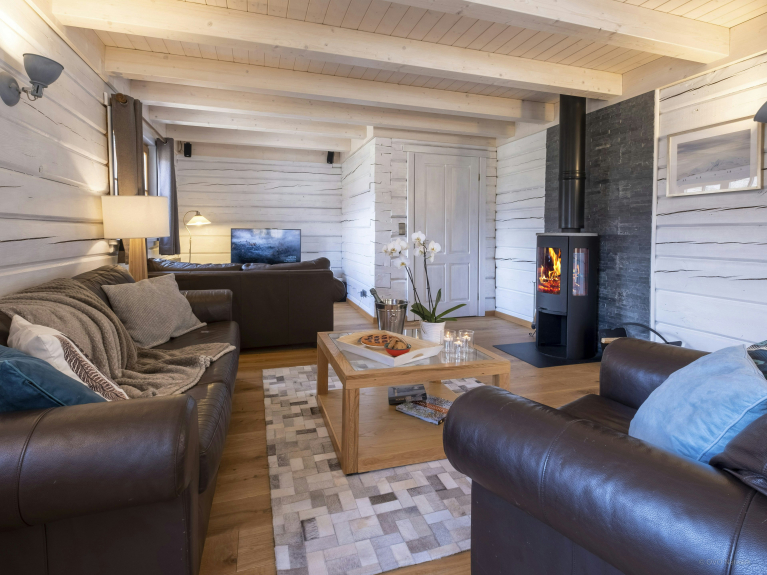 El salón de planta abierta ofrece mucho espacio alrededor de la estufa de leña, frente a la Smart TV y alrededor de la mesa de comedor. Antes de cenar, puedes disfrutar de un aperitivo en la terraza, o incluso disfrutar del exquisito entorno desde el jacuzzi exterior.