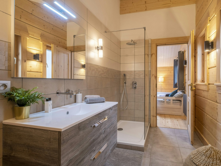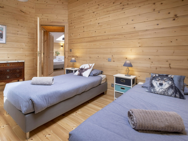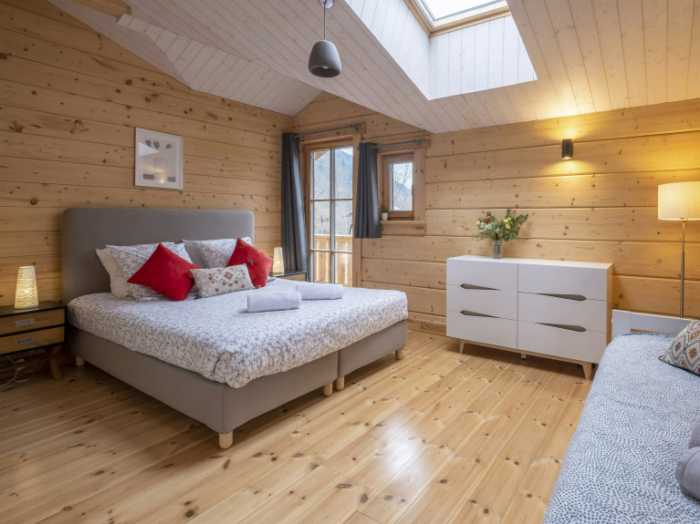 Todas las habitaciones están en la planta superior. Hay una suite principal, con una cama doble, una cama individual y un cuarto de ducha privado, y dos habitaciones dobles, una de las cuales puede convertirse en habitación doble según sus necesidades. Todas se abren a un balcón, desde donde podrá disfrutar del aire fresco de los Alpes y de unas vistas impresionantes.