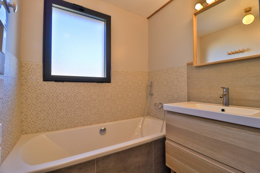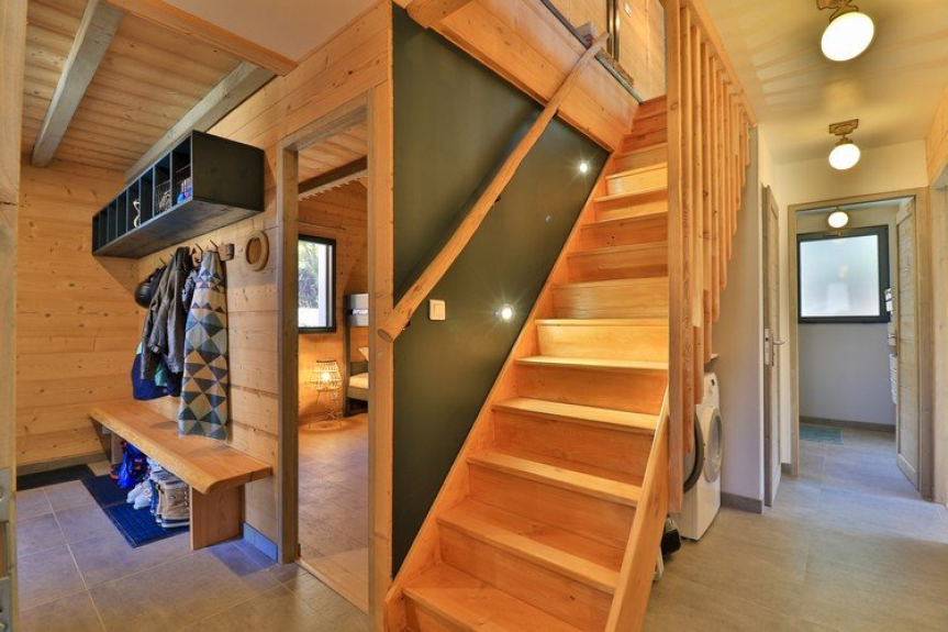 un gran hall de entrada, 3 dormitorios, dos de ellos con 1 cama doble (160 cm) y un dormitorio con 4 camas individuales (una de ellas en el entresuelo), un cuarto de baño, un cuarto de ducha, 2 WC separados. Lavadora.