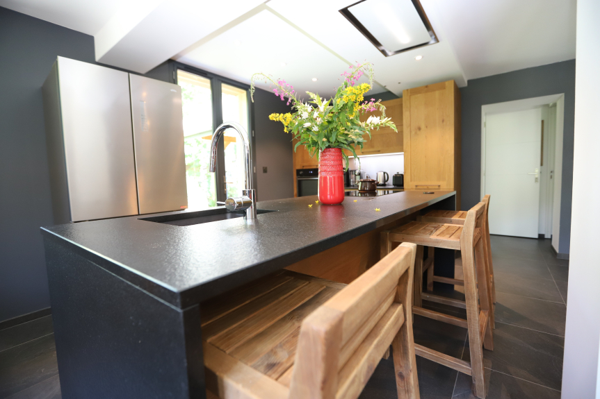 1 gran salón de 50m² con sala de estar con WIFI y TV conectada, comedor, cocina equipada con chimenea; 1 WC; 1 habitación con ducha; 1 sauna con ducha; 1 sala de ropa blanca con lavadora y secadora.