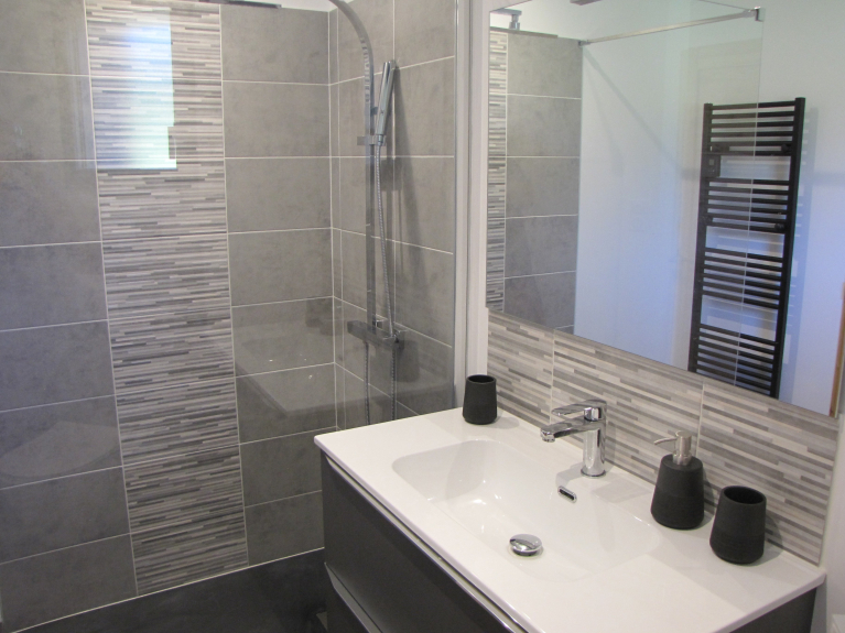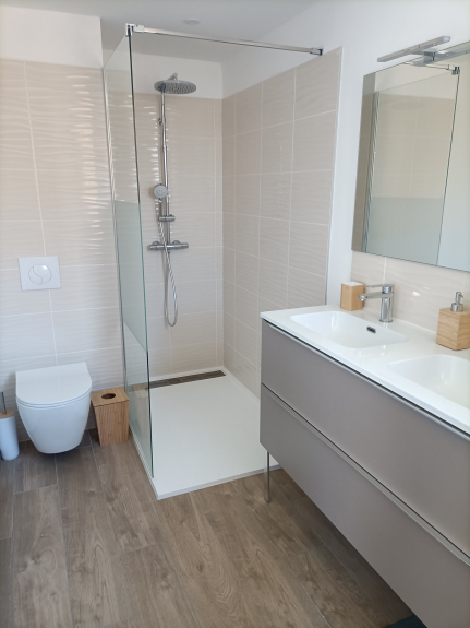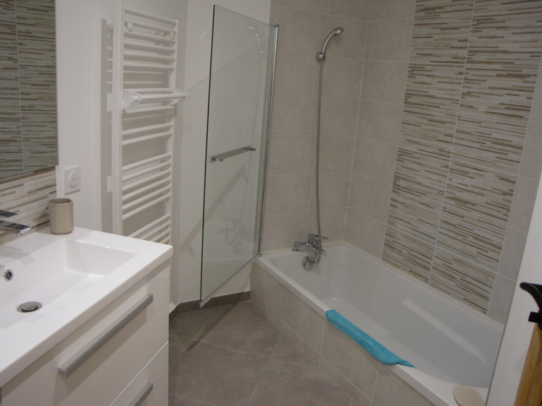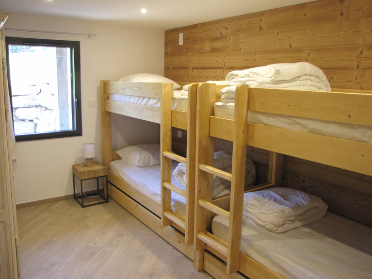 1 dormitorio con 2x2 literas (90x190), 1 cuarto de baño con bañera y lavabo doble,