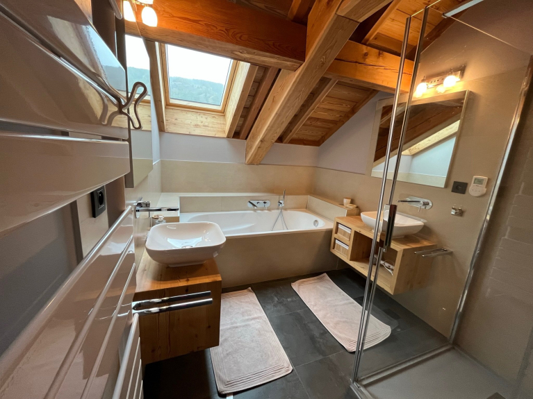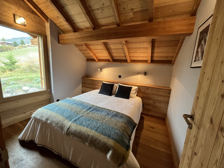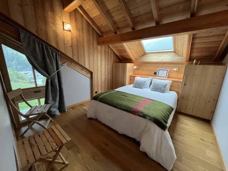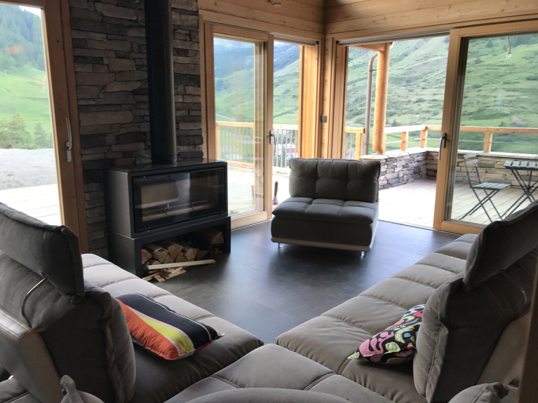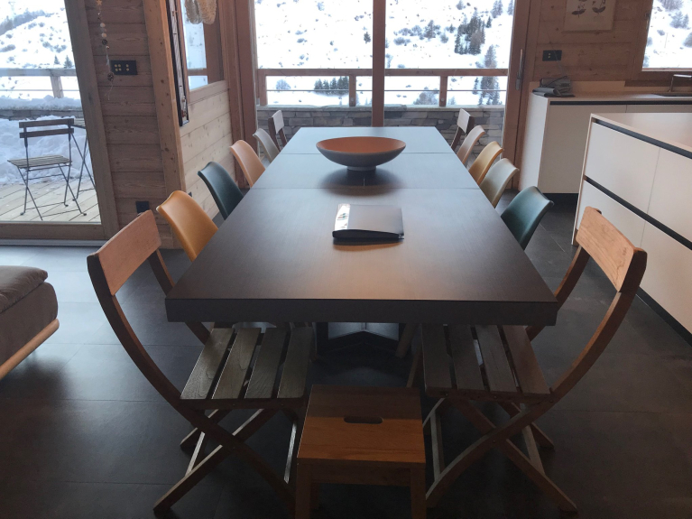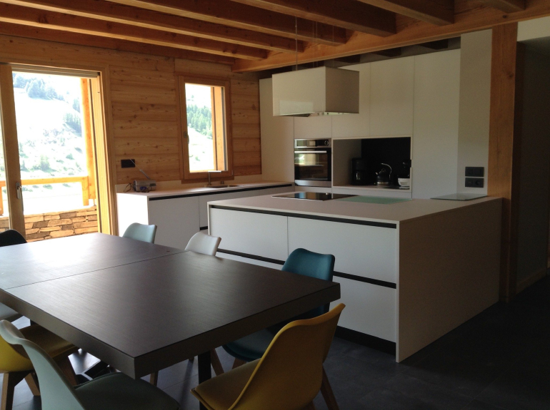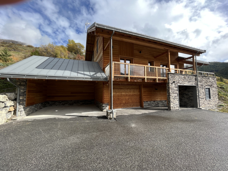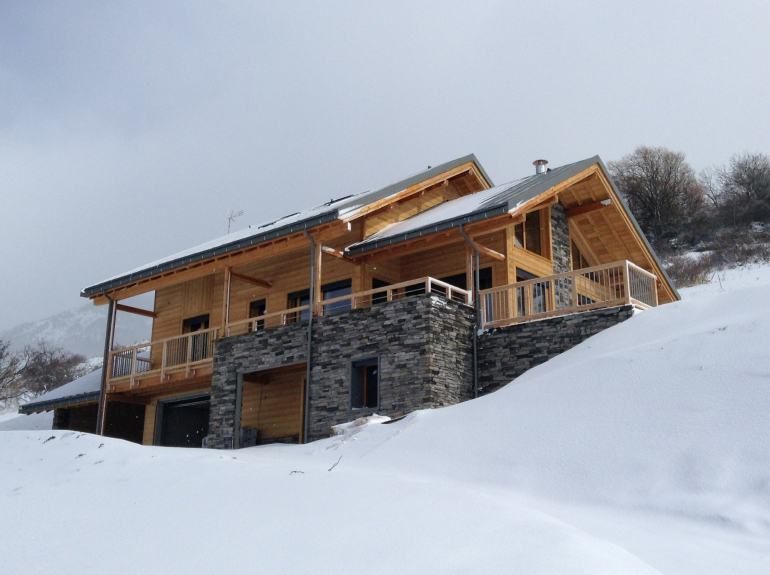 Hemos construido este chalet al estilo tradicional de la región, utilizando alerce y piedra. Construido en tres niveles, tiene una superficie de 180m2, con cuatro dormitorios y un dormitorio para 6 personas, con un cuarto de ducha y un aseo independiente en cada planta. Nada más cruzar la puerta, se entra inmediatamente en un ambiente de chalet de montaña decididamente moderno, abierto al exterior y que ofrece unas vistas excepcionales de las pistas de esquí de Vars Ste Marie y de las cumbres de Eyssina. Hemos querido que esta casa tenga un ambiente acogedor, con un gran salón donde todos puedan reunirse para comer alrededor de la mesa, o para pasar buenos momentos en la sala de estar junto al fuego de la estufa de leña.