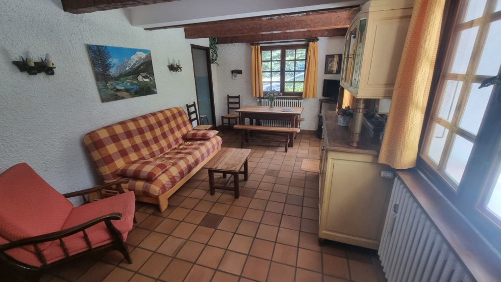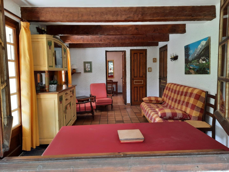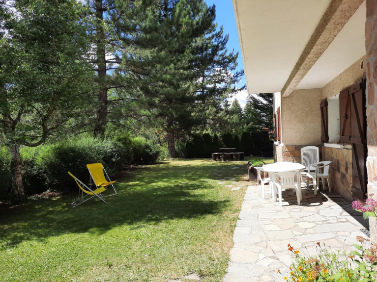 Agradable salón con salida al jardín y a la gran terraza, cocina equipada, habitaciones de estilo montañés