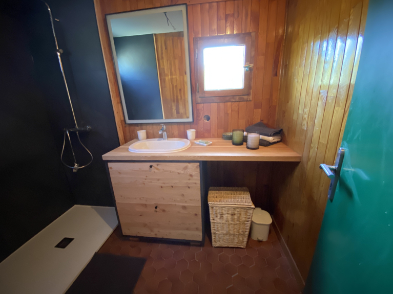 Los cuartos de baño, con sus grandes duchas, suelos de baldosas de pizarra y accesorios de calidad, son lugares que invitan a relajarse después de esquiar o hacer senderismo.