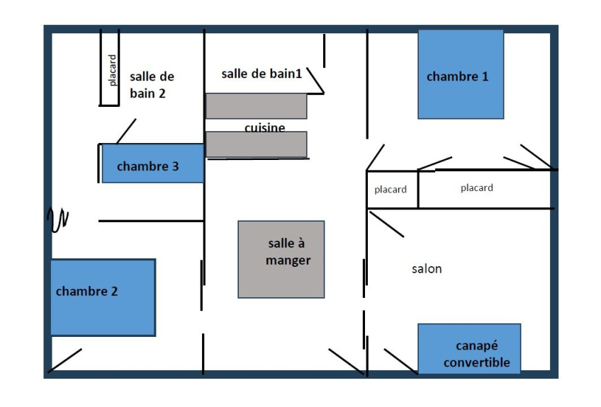 3 habitaciones (2 camas dobles y 1 litera) + 1 sofá cama en el salón