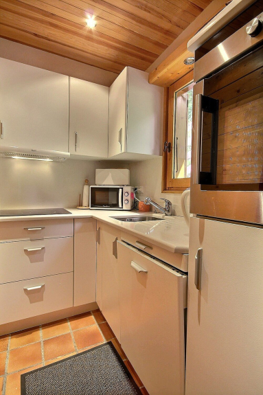 Cocina independiente totalmente equipada (con ventana): nevera, placa de inducción, campana extractora, horno, microondas, lavavajillas.