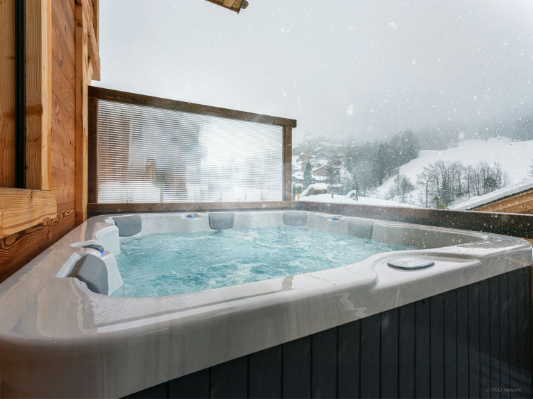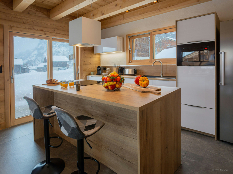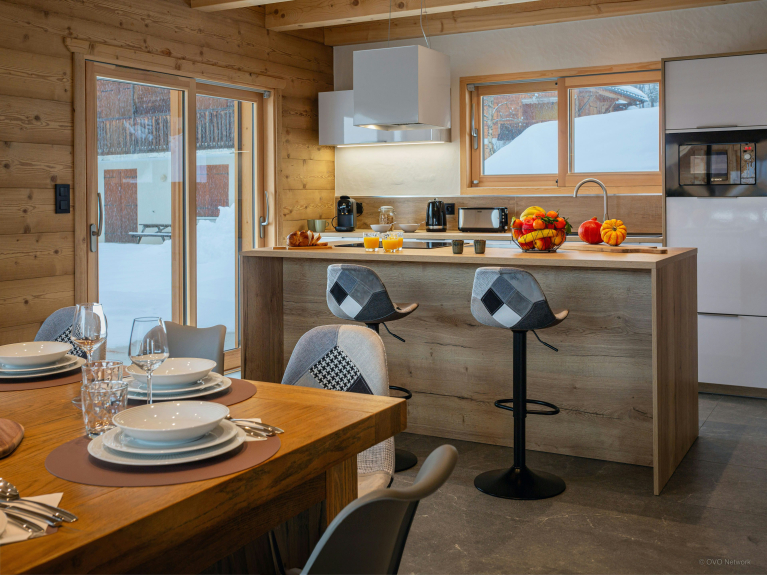 El chalet dispone de una amplia sala de estar de planta abierta con una cocina totalmente equipada, una gran mesa de comedor y acceso a una terraza amueblada que se extiende por 2 lados del edificio. Aquí podrán disfrutar juntos de un aperitivo, encender la barbacoa o relajarse en el jacuzzi exterior.