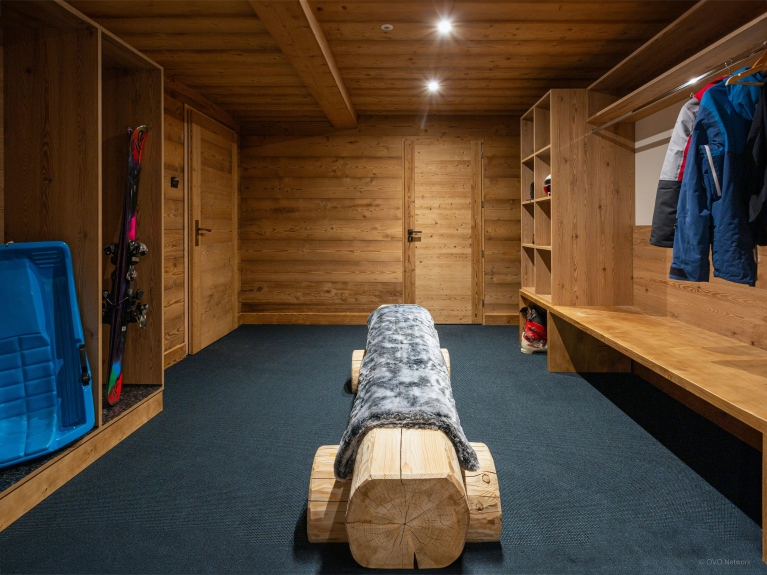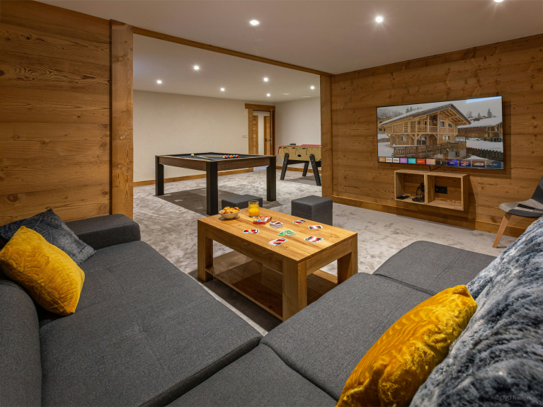 Una segunda entrada, a nivel del jardín, conduce a una habitación segura donde podrá cambiarse de ropa de exterior y guardar sus esquís o bicicletas. En el mismo nivel hay una sala de juegos con futbolín, dardos y una mesa de billar convertible en mesa de ping-pong. También hay una sala de estar con TV.