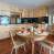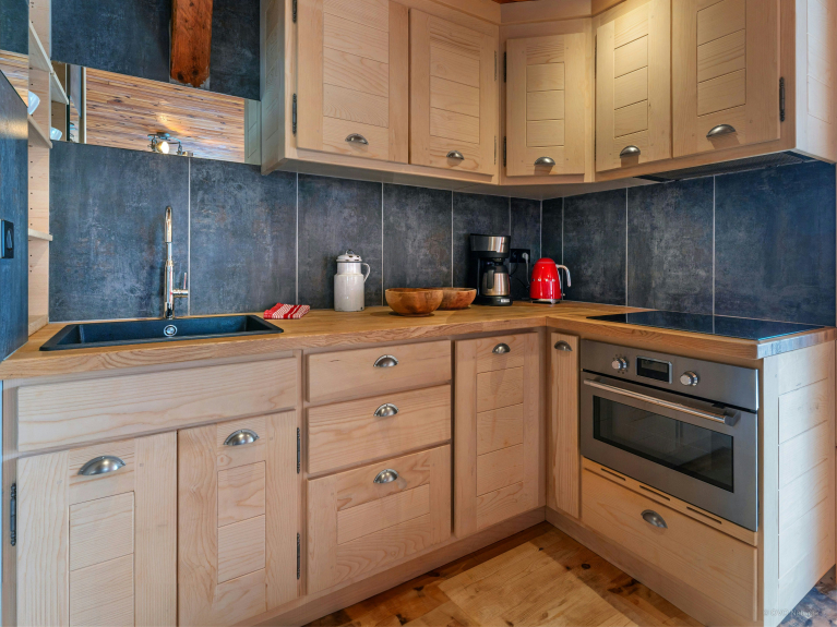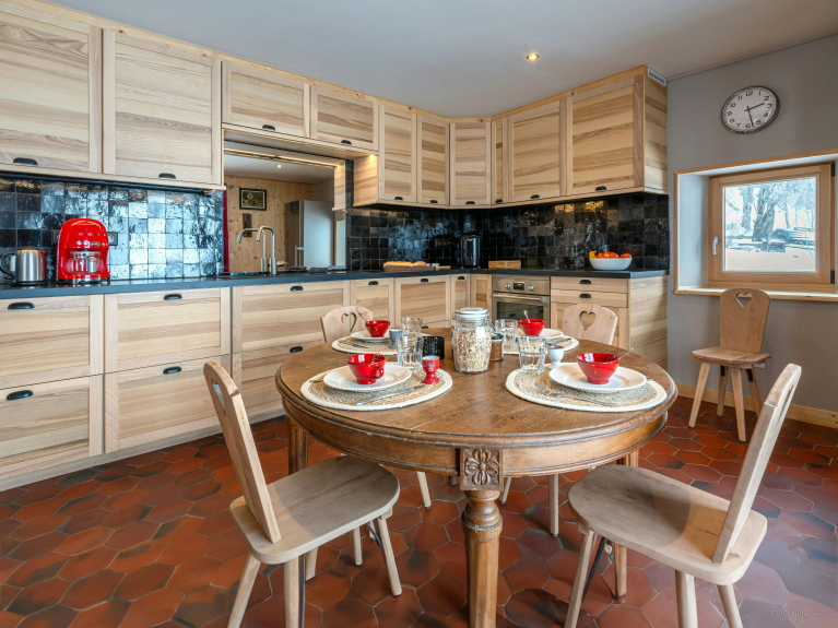 La zona de estar se divide en un cómodo salón, con mesa de comedor, sillones y estufa de leña, y una cocina totalmente nueva, equipada con todos los electrodomésticos y utensilios que necesitará durante su estancia. Varias ventanas francesas iluminan esta estancia y dan a una terraza ajardinada, donde también podrá disfrutar de sus comidas cuando haga buen tiempo.