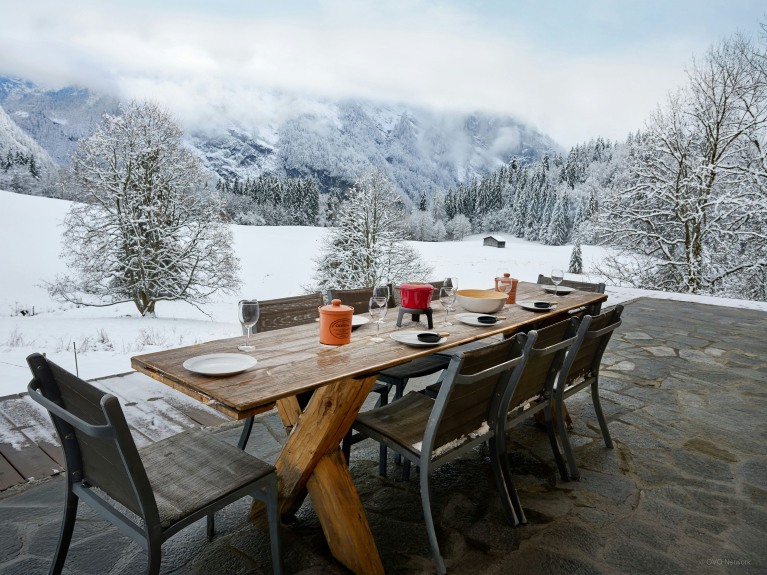 En el exterior, el amplio jardín y la terraza ofrecen unas vistas impresionantes del valle y las montañas circundantes.