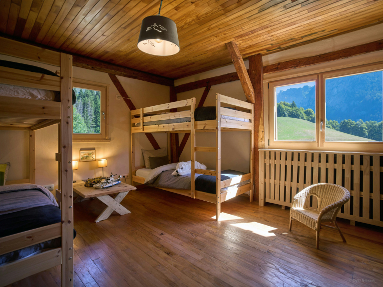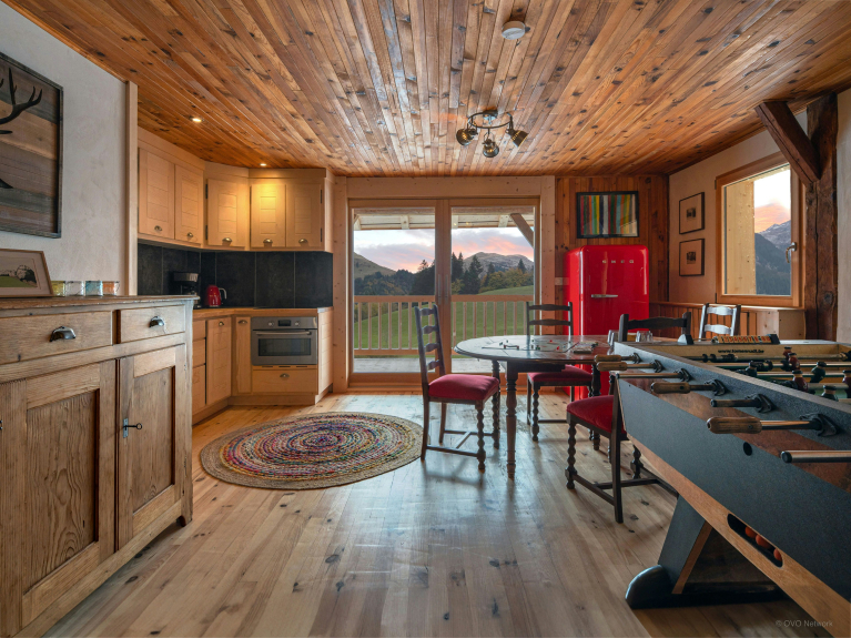 En la planta superior hay 3 dormitorios y 2 cuartos de ducha. Hay 2 habitaciones dobles y un dormitorio con 2 literas. En esta planta también se encuentra la sauna y una 2ª sala de estar, con futbolín, cocina americana y acceso a un balcón. Nos gusta especialmente esta sala, que permitirá reunir a todo su grupo, sean cuales sean sus deseos.