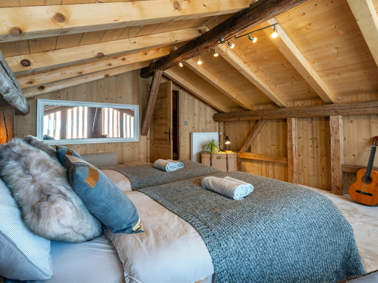 Bajo las vigas se encuentra el último dormitorio, con 2 camas individuales y un 4º cuarto de ducha.