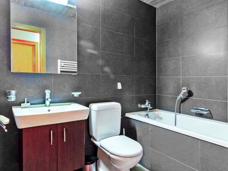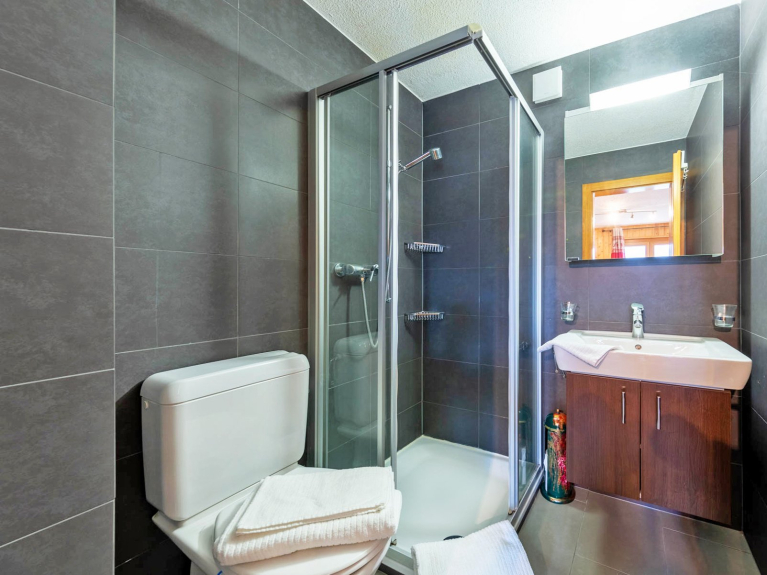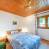 Planta superior: tres dormitorios, todos con cama de matrimonio (160 x 200 cm). Dos de las habitaciones tienen acceso al balcón orientado al este. Cuarto de baño con bañera, lavabo y WC. En esta planta se encuentra la entrada principal del chalet, con acceso directo a la sala de esquí y a la pista.