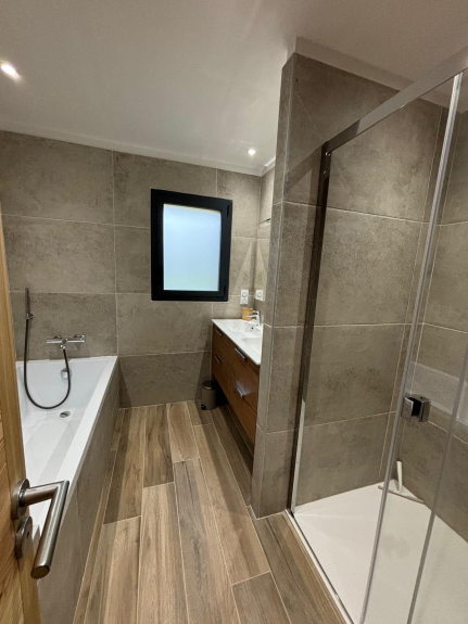 1 cuarto de baño independiente con ducha, bañera y lavabo doble