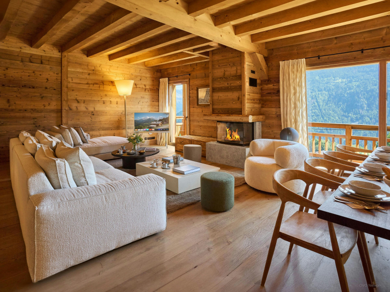 El amplio y luminoso salón se encuentra en la planta baja. Cuenta con un gran sofá modular frente a una chimenea, una mesa de ajedrez y una mesa de comedor que puede acomodar a todo su grupo. La cocina americana, equipada con horno, placa de inducción, lavavajillas, frigorífico-congelador, microondas y encimera central con taburetes, es ideal para preparar comidas. Las ventanas francesas dan a una terraza cubierta, donde podrá disfrutar de la barbacoa y del majestuoso panorama alpino.