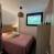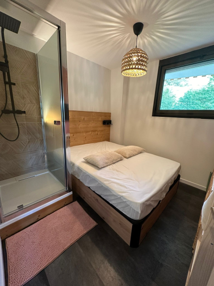 Dormitorio principal con cama nido de 140x190, TV mural, espacio de almacenamiento, ducha independiente, cabecero con cargadores de inducción, ventana con persiana enrollable.