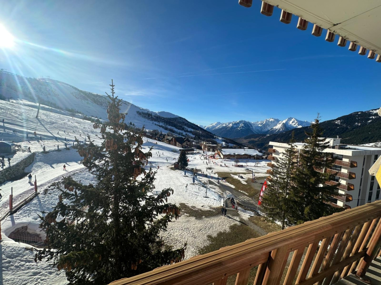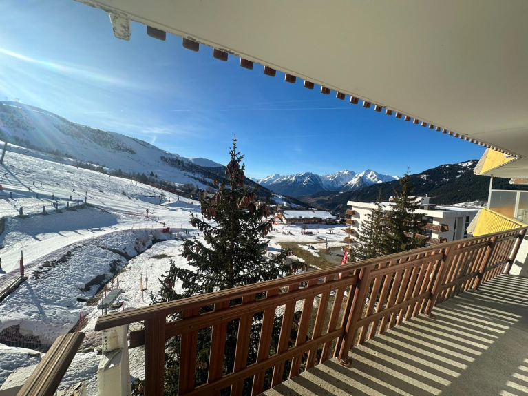 Piso esquinero con terraza circundante, situado en la 5ª planta de la residencia Lauzière, a pie de pistas y del telesilla Lune Bleue. La residencia cuenta con dos ascensores y un guardaesquís. Vistas ininterrumpidas a numerosas pistas de la estación y a las montañas en el horizonte.