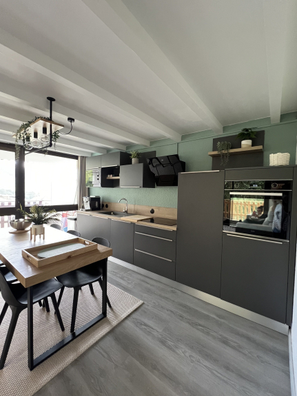 Salón con cocina nueva amueblada y equipada, aspiradora Dyson, sofá cama con cama de calidad de 140*190, TV Led grande y mueble de almacenaje bajo la TV. Mesa de comedor con 6 sillas.